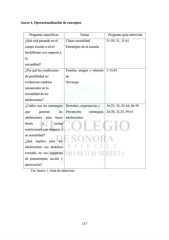 Anexo 4. Operacionalización de conceptos Preguntas específicas Temas Preguntas guía entrevista ¿Qué está pasando en el Clases sexualidad 51-58, 31, 35-41 campo escolar a nivel Estrategias de la escuela bachillerato con respecto a la sexualidad? ¿Por qué las condiciones Familia, amigos y relación 1-15,45 de posibilidad no de evidencian cambios Noviazgo sustanciales en la sexualidad de los adolescentes? ¿Cuáles son las estrategias Derechos, experiencias y 16-23, 34, 42-44, 46-50 que generan los Percepción, estrategias 24-30, 32,33, 59-61 adolescentes para hacer adolescentes frente a ciertas restricciones con respecto a su sexualidad? ¿Qué implica para los adolescentes sus derechos sexuales en sus esquemas de pensamiento, acción y apreciación? Ver Anexo 1. Guía de entrevista 157