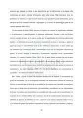 anuncios que indiquen su oferta, lo que imposibilita que los adolescentes se acerquen a las instituciones de salud a solicitar información sobre salud sexual. Ellas detectaron otros dos problemas en relación a los servicios de salud sexual y reproductiva para adolescentes, que la oferta de servicios continúa enfocada a las mujeres y la escasez de demanda por parte de los varones (periodo 2007-2012). En otro estudio de Stern (2004), que tuvo el objetivo de conocer los significados atribuidos a la adolescencia y específicamente al embarazo adolescente, llevado a cabo en diversos sectores sociales del país, en la cual se resalta que los significados del embarazo adolescente tienden a ser diferentes de acuerdo al contexto sociocultural en el que se presenta, y analiza el papel que juega la vulnerabilidad social en los embarazos adolescentes. El autor señala que los elementos que constituyen dicha vulnerabilidad social son las desiguales relaciones de género, el acceso desigual a educación e información, seguridad social, oportunidades laborales y el contexto familiar (Stern 2004). Por su parte, Szasz reconoce que en diversos contextos la sexualidad está ligada a la maternidad y de esta manera llega a ser un vehículo de movilidad social para las mujeres, pero también de estigmatización para quienes no ejercen su maternidad a una edad temprana (2004, 71). De ahí la importancia de contextualizar la sexualidad y los embarazos entre los adolescentes. Para Tuñón y Nazar, el inicio de relaciones sexuales en las mujeres va acompañado del grado de escolaridad. En su investigación realizada con adolescentes solteros del sureste de México, se encontró que el inicio de la sexualidad en las mujeres está vinculado a un proyecto futuro que se dirige hacia el matrimonio y la maternidad, coincidiendo así con los resultados de Szasz. En cambio, para los hombres la sexualidad está relacionada con la masculinidad y la expresión de su virilidad (2004). Esto constituye uno de los condicionantes estructurales que obstruyen el ejercicio de derechos sexuales, vinculado a los valores culturales tradicionales y a un sistema de género que produce expectativas sociales diferentes para hombres y mujeres, 22