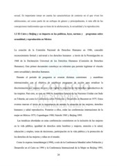 sexual. Es importante tomar en cuenta las características de contexto en el que viven los adolescentes, así como partir de un enfoque de género y principalmente, ir más allá de las concepciones tradicionales que se tiene de la adolescencia, la sexualidad y la reproducción. 1.2 El Cairo y Beijing y su impacto en las políticas, leyes, normas y programas sobre sexualidad y reproducción en México La creación de la Comisión Nacional de Derechos Humanos en 1946, concedió reconocimiento formal y universal a los derechos humanos a través de la Promulgación en 1948 de la Declaración Universal de los Derechos Humanos (Comisión de Derechos Humanos). Este primer documento constituye un referente que permite legitimar el vínculo entre sexualidad y derechos humanos. Durante el periodo de posguerra se crearon distintas comisiones y asambleas internacionales con el objetivo de establecer programas de acción para erradicar la discriminación por razones de sexo y de vigilar la situación de los derechos reproductivos de las mujeres. Para esto, se crea en 1968 la Asamblea General de las Naciones Unidas con Sede en Teherán, así como la Conferencia sobre Población y Desarrollo en Bucarest en 1975. Estos eventos marcan el inicio de la importancia de atender la situación de las mujeres, derechos humanos y salud reproductiva. Posterior a ellos, están las conferencias internaciones de la mujer en México 1975, Copenhague 1980, Nairobi 1985 y Beijing 1995. Las temáticas abordadas en estas conferencias consistieron en la inclusión de las mujeres en la vida pública, igualdad de derechos entre hombres y mujeres, atención a la salud, educación y empleo, toma de decisiones, participación en la vida pública y la protección de los derechos de las mujeres y niñas en el mundo. Como lo expresa Amuchástegui (1998), a raíz de la Conferencia Mundial sobre Población y Desarrollo en el Cairo en 1994 y la Conferencia Internacional de la Mujer en Beijing 1995, 26