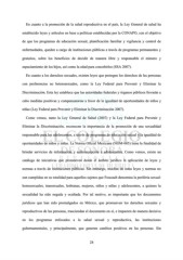 En cuanto a la promoción de la salud reproductiva en el país, la Ley General de salud ha establecido leyes y artículos en base a políticas establecidas por la CONAPO, con el objetivo de que los programas de educación sexual, planificación familiar y vigilancia y control de enfermedades, queden a cargo de instituciones públicas a través de programas permanentes y gratuitos, sobre los beneficios de decidir de manera libre y responsable el número y espaciamiento de los hijos, así como la edad para concebirlos (SSA 2007). En cuanto a los derechos sexuales, existen leyes que protegen los derechos de las personas con preferencias no heterosexuales, como la Ley Federal para Prevenir y Eliminar la Discriminación. Esta ley establece que las autoridades federales y órganos públicos llevarán a cabo medidas positivas y compensatorias a favor de la igualdad de oportunidades de niños y niñas (Ley Federal para Prevenir y Eliminar la Discriminación 2007). Como vemos, tanto la Ley General de Salud (2007) y la Ley Federal para Prevenir y Eliminar la Discriminación, reconocen la importancia de la promoción de una sexualidad responsable para los adolescentes, a través de programas de educación sexual y la igualdad de oportunidades de niños y niñas. La Norma Oficial Mexicana (NOM-005) tiene la finalidad de brindar servicios de información y anticoncepción a adolescentes. Como vemos, existe un catálogo de iniciativas que promueven desde el ámbito jurídico la aplicación de leyes y normas a través de instituciones públicas. Sin embargo, muchas de estas leyes y normas no son cumplidas en su totalidad para aquellos sujetos que Foucault denomina la periferia sexual: homosexuales, transexuales, lesbianas, mujeres, niños y niñas y adolescentes, a quienes la sexualidad ha sido negada y ocultada. Por tal motivo, es importante que los documentos jurídicos que han sido promulgados en México, que promueven los derechos sexuales y reproductivos de las personas, trasciendan el documento en sí, e impacten de manera decisiva en los programas enfocados a la salud sexual y reproductiva, las instituciones gubernamentales, y principalmente, que generen cambios positivos en las personas. Sin 28