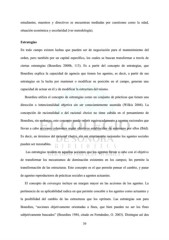 estudiantes, maestros y directivos se encuentran mediadas por cuestiones como la edad, situación económica y escolaridad (ver metodología). Estrategias En todo campo existen luchas que pueden ser de negociación para el mantenimiento del orden, pero también por un capital específico, los cuales se buscan transformar a través de ciertas estrategias (Bourdieu 2000b, 113). Es a partir del concepto de estrategias, que Bourdieu explica la capacidad de agencia que tienen los agentes, es decir, a partir de sus estrategias en la lucha por mantener o modificar su posición en el campo, generan una capacidad de actuar en él y de modificar la estructura del mismo. Bourdieu utiliza el concepto de estrategias como un conjunto de prácticas que tienen una dirección o intencionalidad objetiva sin ser conscientemente asumida (Wilkis 2004). La concepción de racionalidad o del racional choice no tiene cabida en el pensamiento de Bourdieu, sin embargo, este concepto puede referir equivocadamente a agentes racionales que llevan a cabo acciones coherentes según objetivos establecidos de antemano por ellos (Ibíd). Es decir, en términos del racional choice, sin ser enteramente racionales los agentes sociales pueden ser razonables. Las estrategias residen en aquellas acciones que los agentes llevan a cabo con el objetivo de transformar los mecanismos de dominación existentes en los campos; les permite la transformación de las estructuras. Este concepto es el que permite pensar el cambio, y pasar de agentes reproductores de prácticas sociales a agentes actuantes. El concepto de estrategia incluye un margen mayor en las acciones de los agentes. La pertinencia de su aplicabilidad radica en que permite concebir a los agentes como actuantes y la posibilidad del cambio de las estructuras que los oprimen. Las estrategias son para Bourdieu, “acciones objetivamente orientadas a fines, que bien pueden no ser los fines subjetivamente buscados” (Bourdieu 1984, citado en Fernández, O. 2003). Distingue así dos 39
