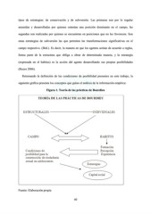 tipos de estrategias: de conservación y de subversión. Las primeras son por lo regular asumidas y desarrolladas por quienes ostentan una posición dominante en el campo, las segundas son realizadas por quienes se encuentran en posiciones que no les favorecen. Son estas estrategias de subversión las que permiten las transformaciones significativas en el campo respectivo. (Ibíd.). Es decir, la manera en que los agentes actúan de acuerdo a reglas, forma parte de la estructura que obliga a obrar de determinada manera, y la estrategia (expresada en el habitus) es la acción del agente desarrollando sus propias posibilidades (Reyes 2006). Retomando la definición de las condiciones de posibilidad presentes en este trabajo, la siguiente gráfica presenta los conceptos que guían el análisis de la información empírica: Figura 1. Teoría de las prácticas de Bourdieu Fuente: Elaboración propia 40