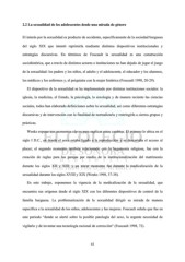 2.2 La sexualidad de los adolescentes desde una mirada de género El interés por la sexualidad es producto de occidente, específicamente de la sociedad burguesa del siglo XIX que intentó reprimirla mediante distintos dispositivos institucionales y estrategias discursivas. En términos de Foucault la sexualidad es una construcción sociohistórica, que a través de distintos actores e instituciones no han dejado de jugar el juego de la sexualidad: los padres y los niños, el adulto y el adolescente, el educador y los alumnos, los médicos y los enfermos y, el psiquiatra con la mujer histérica (Foucault 1998, 20-29). El dispositivo de la sexualidad se ha implementado por distintas instituciones sociales: la iglesia, la medicina, el Estado, la psicología, la sexología y de manera reciente las ciencias sociales, todos han elaborado definiciones sobre la sexualidad, así como diferentes estrategias discursivas y de intervención con la finalidad de normalizarla y restringirla a ciertos grupos y prácticas. Weeks expone tres momentos claves para explicar estos cambios. El primero lo ubica en el siglo I D.C., en donde el sexo estaba ligado a la reproducción y se descartaba el acceso al placer; el segundo momento también relacionado con la hegemonía religiosa, fue con la creación de reglas para las parejas por medio de la institucionalización del matrimonio durante los siglos XII y XIII; y un tercer momento fue durante la medicalización de la sexualidad durante los siglos XVIII y XIX (Weeks 1998, 37-38). En este trabajo, exponemos la vigencia de la medicalización de la sexualidad, que encuentra sus orígenes desde el siglo XIX con los diferentes dispositivos de control de la familia burguesa. La problematización de la sexualidad dirigió su mirada de manera específica a la sexualidad de los niños, adolescentes y las mujeres. Foucault señala que fue en este periodo “donde se alertó sobre la posible patología del sexo, la urgente necesidad de vigilarlo y de inventar una tecnología racional de corrección" (Foucault 1998, 72). 41