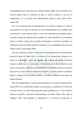 de posibilidades para la realización de la condición humana (2000). Son los individuos y sus derechos quienes están en condiciones de guiar al estado de derecho y velar por su cumplimiento y no a la inversa como tradicionalmente plantea la ciencia política (Ortiz- Ortega 1999). Uno de los obstáculos para la materialización de los derechos sexuales es la falta de reconocimiento de un sujeto de derechos, así como el planteamiento de la sexualidad como “acto privado” o, como menciona Frasser, a través de la imposición de necesidades ajenas a los grupos sociales que enfrentan dicha necesidad, así como despolitizar una preocupación política o clasificar el tema como no político. Por ejemplo, el concebir la sexualidad y la reproducción como actividades meramente biológicas y en su complejidad como acto social (Frasser, citado en Ortiz-Ortega, 2004). Otro de los obstáculos a tomar en cuenta para la materialización de los derechos sexuales proviene del papel del Estado laico y la influencia de las normatividades religiosas en el terreno de la sexualidad. A pesar del desarrollo que ha habido en cuestión de derechos sexuales y reproductivos, se ha demostrado un estancamiento por la falta de difusión de estos entre los adolescentes, además de la recomendación de la abstinencia incluso en ambientes laicos como la escuela. Desde las instituciones religiosas y la Iglesia Católica en particular, tienden a continuar con este discurso represivo y moralista, violando de esta manera los derechos humanos. Partir de las subjetividades es menester para aproximarnos al concepto de derechos (Ortiz- Ortega 1999, 35). La subjetividad se refiere a lo más próximo a la experiencia, “es la forma de un mundo interior, un mundo propio que puede quedar guardado para sí, o bien mostrarse, relegarse al trasfondo o expresarse intencionalmente a los demás” (Heller 1993, citado en Rodríguez 2001). Para Bourdieu, la subjetividad es “el proceso de producción de 48