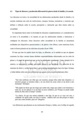 4.1 Tipos de discurso y producción diferencial de género desde la familia y la escuela Los discursos en torno a la sexualidad de los adolescentes producidos desde la familia y la escuela contienen una serie de restricciones, consejos, bromas, normativas y creencias que definen e influyen sobre la acción, percepción y valoración que ellos tienen sobre su sexualidad. Es importante hacer notar la diversidad de discursos complementarios y/o contradictorios en torno a la sexualidad, y la manera en que los adolescentes tienden a interiorizar y configurar los discursos. Estos discursos sobre sexualidad en la familia se encuentran moldeados por dispositivos generacionales y de género. Este último, como menciona Scott, como la forma primaria de las relaciones de poder (Scott 1996). El trato que dan los padres hacia las hijas, es diferente, en la medida en que en algunas ocasiones los hijos varones tienen distintas responsabilidades relacionadas con los roles de género y el papel de protectores que se les ha adjudicado socialmente. Como ejemplo de lo anterior, se encuentra el cuidado que deben ofrecer a sus hermanas y la reducción de las muestras de afecto y cariño hacia ellos y que se dirige principalmente hacia las hijas. Enrique y Julián hablan sobre este trato diferencial que genera cierta inconformidad para ellos: “Son más cariñosas con ellas que con nosotros, porque ellas están más chiquitas y a nosotros porque ya tenemos edad, y no nos dicen las cosas cómo se las dicen a mis hermanas” (Enrique) “Mis papás me dicen que me tengo que cuidar más, tengo que cuidar a mis hermanas y todo eso, en ese aspecto sí se me hace un poco enfadoso ¿no? Porque no puedo andar detrás de ellas todo el tiempo” (Julián) “La clásica, de que una mamá cuidando a una hija, de que no se vaya con este, o cuidando con quién anda, nos dice lo mismo, enfatiza más con ella porque es mujer, pero uno como hombre, pues no” (Rogelio) Las diferencias que plasman en sus testimonios Enrique y Julián, son el reflejo de aquella 66