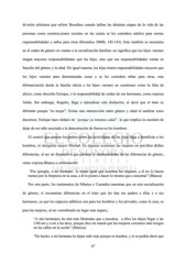 división arbitraria que refiere Bourdieu cuando define las distintas etapas de la vida de las personas como construcciones sociales en las cuales se les considera adultos para ciertas responsabilidades y niños para otras (Bourdieu 2000b, 142-143). Esto también se encuentra en el orden de género en cuanto a la socialización familiar; no significa que los hijos varones tengan mayores responsabilidades que las hijas, sino que sus responsabilidades varían en función del género y la edad. De igual manera, las hijas tienen responsabilidades mayores que los hijos varones para determinadas cosas y se les considera niñas para otras, esta diferenciación desde la familia afecta a los hijos varones en cuestiones como la falta de afecto, como describe Enrique, o la responsabilidad de cuidar de sus hermanas, como expresa Julián. Sin embargo, Rogelio, llega a naturalizar esta distinción, al decir que el trato es diferente porque “es mujer”. Existe una intersección entre género y edad al analizar estos discursos; Enrique hace énfasis en “porque ya tenemos edad”, lo que implica la cuestión de dejar de ser niño asociada a la demostración de fuerza en los hombres. El control que ejercen los padres sobre las actividades de las hijas llega a beneficiar a los hombres, al otorgarles mayor libertad. En algunas ocasiones las mujeres no perciben dichas diferencias, al ser un dispositivo que permite el mantenimiento de las diferencias de género, cómo expresa Blanca a continuación: “Por ejemplo, a mi hermano lo tratan igual que nosotras las mujeres, a él no lo hacen menos por la limpieza en la casa, a él lo ponen a hacer lo mismo que a nosotras” (Blanca) Por otra parte, los testimonios de Mónica y Casandra muestran que en esta socialización de género, sí encuentran diferencias en el trato que les dan sus padres a ellas y a sus hermanos, ya que los espacios públicos son para los hombres y los privados, como la casa, es para las mujeres, al ser considerado un lugar más seguro,: “A mis hermanos les dan más libertades que a nosotras, a ellos los dejan llegar a las 2:00 am y a mí a las doce, porque dice mi mamá que las mujeres corremos más riesgos en las calles en la noche” (Mónica) “De hecho, a mi hermano lo dejan salir más porque es hombre, y sí se podría decir que 67