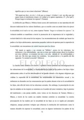 significa que ya van a tener relaciones” (Blanca) “Mi mamá me dice: ¡Ay de ti el día que ya tengas! ¡Cuídate! y así me dice que me espere hasta el matrimonio (risas) y la verdad yo sí quiero esperarme, (Y: ¿Por qué?): Porque luego te reclaman los esposos” (Tamara) La definición que Blanca y Mónica tienen acerca del matrimonio es una reproducción del discurso tradicional de los valores familiares, que se concibe como un estado único de ejercer la sexualidad, en el cual a su vez, como expresa Tamara “luego te reclaman los esposos”, la violencia también se manifiesta a través la promoción de la importancia de la virginidad y exclusividad de la vida sexual de las mujeres. Las recomendaciones de cuidado que hacen los padres a los hijos adolescentes, representan pequeños indicios de apertura para la expresión de la sexualidad, con mecanismos de control mayores para las chicas: “Mi mamá se agarra y me avienta un “biblión”, acerca de las relaciones, los embarazos y las enfermedades; que uno se tiene que cuidar porque ahora los hombres son muy cochinos, se acuestan con una y con otra, además de las enfermedades y todo eso. Me dice que existen los condones, los preservativos y la pastilla del día siguiente. Yo nomás la escucho” (Mónica) La familia como instancia de control y vigilancia sexual presenta una reconfiguración de las valoraciones de la sexualidad. La recomendación por parte de los padres a las hijas e hijos adolescentes sobre el uso de anticonceptivos ha ganado terreno a los dogmas religiosos que velaban la expresión de la sexualidad; las enfermedades de transmisión sexual y los embarazos no deseados son las consecuencias que los padres desean evitar en la sexualidad de los hijos, más allá del inicio de las relaciones sexuales. Sin embargo, la prescripción de este tipo de cuidados en las mujeres se sustentan en el modelo del amor romántico, bajo la premisa del matrimonio y una pareja estable, como vemos en los discursos de Tamara, Mónica y Blanca, a través de los cuales sus madres intentan controlar su sexualidad. La notoria preocupación de las madres por la sexualidad de las hijas ya no es regida por preceptos religiosos, aunque persisten vestigios que refuerzan la institución del matrimonio como la manera deseable de expresar la sexualidad, como en algunos testimonios los padres de las 72