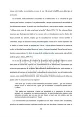 chicas entrevistadas recomendaban, en caso de una vida sexual ineludible, usar algún tipo de protección. En la familia, tradicionalmente la sexualidad de los adolescentes no es concebida de igual manera para hombres y mujeres. Los padres tienden a aceptar abiertamente la sexualidad de los adolescentes varones al permitir que los chicos lleven a sus novias o amigas a sus casas y “exhiban cierta cuota de vida sexual ante la familia” (Burin 1998, 91). Sin embargo, Burin menciona que dicha permisividad en los varones solo es tolerada dentro de los límites del hogar parental. Lo anterior, implica que la sexualidad de los hijos varones también es controlada, aunque de diferente manera por ambos padres. Fuera de los límites impuestos por la familia, el control sexual se equipara para chicos y chicas debido al temor de los padres de perder su identidad generacional dentro del hogar, al otorgar demasiada libertad sexual tanto a hombres como mujeres. Es decir, el riesgo de la pérdida de poder generacional, más allá del poder de género (Burin, 1998: 91). En el caso de los varones, el contenido de las pláticas de sexualidad que tienen los padres hacia ellos se vuelve más explícito. En los testimonios de los adolescentes encontramos que existe una preocupación de los padres por reafirmar la masculinidad de los hijos mediante la ampliación del margen de permisividad, expresada en la promoción del uso del condón en los varones, como indica el testimonio de Juan, al mencionar el tipo de consejos que le daban sus padres sobre “la atracción hacia las mujeres”: “Nos dicen que si vamos a tener relaciones que usemos condón… que nos cuidemos, porque un tío se murió de sida y pues que no fuéramos a cometer el mismo error” (Tomás) “Mis papás nos empezaron a hablar de sexualidad en el transcurso de sexto de primaria a la secundaria; los cambios corporales, la atracción hacia las mujeres, sobre relaciones sexuales, que en caso de que llegara a tener que me cuidara, que hay muchos métodos anticonceptivos” (Juan) Las conversaciones que mantienen los padres con los hijos varones sobre sexualidad y prácticas de cuidado son más explícitas con ellos que con las chicas. Podemos ver como la 73