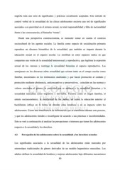 engloba toda una serie de significados y prácticas socialmente aceptadas. Este método de control verbal de la sexualidad de las chicas adolescentes encierra una red de significados asociados a su pasividad en el terreno sexual, su total responsabilidad y falta de racionalidad frente a las consecuencias, al llamarlas “tontas”. Desde una perspectiva construccionista, es menester tomar en cuenta el contexto sociocultural de los agentes sociales. La familia como espacio de socialización primaria reproduce un discurso biomédico de la sexualidad, que también se imparte durante la educación sexual en el espacio escolar. La similitud en estos espacios radica en que comparten una visión de la sexualidad heterosexual y reproductiva, que legitima la expresión sexual de los varones y restringe la sexualidad femenina al espacio reproductivo. Las semejanzas en los discursos sobre sexualidad que existen tanto en el campo escolar como familiar, encontrados en los testimonios analizados y que hacen promoción al cuidado y protección mediante abstinencia, anticonceptivos y preservativos, coinciden en las normas y valores asociados al género, la pasividad que se atribuye a la sexualidad femenina y la sexualidad masculina como impulsiva e inevitable. Factores como el origen familiar, el estrato socioeconómico, la escolaridad de los padres, así como la educación anterior al bachillerato influye en la forma de abordar estas temáticas y en su impacto sobre los adolescentes. Existe una transferencia de información que se transforma durante este proceso, y que los adolescentes tienden a reconfigurar de acuerdo a sus prácticas e inconformidades. Esto se verá a continuación al analizar las percepciones e intereses que tienen los adolescentes respecto a la sexualidad y los derechos. 4.2 Percepción de los adolescentes sobre la sexualidad y los derechos sexuales Los significados asociados a la sexualidad de los adolescentes están marcados por estereotipos tradicionales de género derivados de un modelo hegemónico masculino. Los adultos definen la sexualidad de hombres y mujeres adolescentes bajo diferentes mecanismos 80