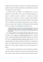 de vigilancia y control. Sin embargo, en muchos de los casos analizados, los adolescentes no reproducen el discurso de los adultos de manera literal, sino que también ellos los cuestionan y los configuran en sus discursos y prácticas. Los adolescentes tienen una concepción de la sexualidad basada en el coito, la reproducción, la relación de pareja, el amor y también la diferenciación biológica de los cuerpos. Los estereotipos de género se reproducen en la concepción que tienen los adolescentes sobre su sexualidad. En las mujeres, sus expectativas sobre sexualidad se encuentran marcadas por ideas ligadas al amor romántico, derivadas de la cultura occidental, es decir, la importancia de tener una relación de pareja basada en el amor, que legitime el inicio de las relaciones sexuales. En algunos casos, también añaden elementos importantes como el vivir la experiencia y la necesidad del placer. Rosa cuenta sobre esto: “Yo quería saber qué es, yo quiero vivirlo y no quiero que llegue alguien y me cuente, yo también quiero saber qué es, pero lo vi más como una experiencia, a decir: Ay es mi novio y lo amo y quiero hacerlo, sí lo amo, pero creo que fue una experiencia muy bonita” (Rosa) Rosa define la sexualidad a través de una concepción moderna que se ha ido legitimando entre algunas mujeres, a pesar de los estereotipos de género dominantes que mantienen invisible la sexualidad de las mujeres y el acceso al placer. Este testimonio nos da elementos para reconocer la capacidad de las mujeres de autorizarse y ejercer su derecho a vivir una sexualidad desligada de los mandatos tradicionales del matrimonio y la reproducción. Sin embargo, esto no significa que todas las mujeres entrevistadas compartan esta concepción, ni tampoco que las nociones modernas de libertad sexual que tiene Rosa impacten en sus prácticas. El discurso del miedo se encuentra presente en las mujeres al hablar sobre sexualidad. La culpa, como resultado de la interiorización de los discursos que emiten instituciones sociales como la familia y la escuela, funciona como dispositivo interno que les permite controlar y 81