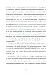 homogénea, sino que es producto de una construcción sociohistórica que se va configurando en distintas épocas. La década de los sesenta fue crucial en la transformación de la vida de las personas, de organizar su vida cotidiana, las relaciones familiares y la moral sexual. Por ejemplo, la crisis económica modificó el papel del hombre proveedor, la incorporación de las mujeres a la esfera económica y sus peticiones de igualdad desligaron la sexualidad de la unión conyugal (Cosse 2008, 132). En ese sentido, Lupita habla de la importancia del “tiempo”, dispositivo de control que ha adquirido diferentes connotaciones, es decir, aunque aún implique una restricción sobre el inicio de las relaciones sexuales, marca diferencias con los significados asociados antaño, como la preeminencia del matrimonio y la reproducción. La importancia de hacerlo a “su tiempo” como un elemento que permite madurar, es resultado de una visión biomédica relacionada con los cambios del cuerpo y su preparación para el inicio de las relaciones sexuales y posiblemente su rol de madre, pero también, desde un punto de vista social, se relaciona con la importancia de tener una carrera, y posteriormente, un trabajo remunerado, resultado de la normalización de las expectativas de vida en la sociedad occidental. Las transformaciones en el terreno de la sexualidad durante diferentes periodos históricos a la actualidad, no se han relajado, como sugiere Cosse, sino que se han redefinido, y aunque los cambios en las premisas dominantes representen una liberación para las mujeres, el matrimonio continúa siendo el espacio legítimo del amor, la sexualidad y la reproducción (Cosse 2008, 133). Para los hombres, el miedo está relacionado con el desempeño de un papel de proveedor, así como de un compromiso a futuro con la pareja. Para Germán, el tener relaciones sexuales con su novia, significa alejarse de sus prácticas sexuales con otras mujeres fuera de su relación de pareja, estigmatizando el placer sexual de su pareja con la expresión “capaz que le 83