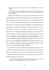 “Cuando lo hago es porque lo quiero, lo hago para demostrarle que lo quiero” (Sandra) “Pero yo pienso que no es nada más ¡ay! tengo ganas o ¡ay! se me antoja, yo pienso que no nomás es por eso, yo pienso que si lo vas a hacer es porque quieres a la persona” (Emilia) El vínculo entre sexualidad y amor es característico de la construcción sociocultural sobre la sexualidad femenina. Como menciona Marcela Lagarde, “sexo, sexualidad y amor son una tríada natural asignada a las mujeres. Son la esencia del mito sobre la naturaleza femenina (2008, 10)”. Es por ello, que la legitimación del placer sexual se realiza dentro de la esfera del amor romántico; en los discursos anteriores, ellas hablan de la necesidad de hacerlo para demostrar afecto a la pareja, incluso cuando ellas no querían tener relaciones sexuales. En ello, encontramos que el placer de las mujeres se dirige hacia el futuro, es decir, la reproducción de una sexualidad construida para el placer del otro y no para el propio, con la finalidad de asegurar las expectativas matrimoniales que tienen las mujeres. Sin embargo, el movimiento feminista ha reivindicado el placer sexual y la autonomía corporal como uno de sus ejes fundamentales para lograr la liberación de las mujeres y un pleno ejercicio de derechos. Los testimonios anteriores, “lo hice más por él” o “lo hago para demostrarle que lo quiero”, ejemplifican la valoración que tienen algunas mujeres sobre su sexualidad cuando no existe un adecuado conocimiento de su cuerpo y sus placeres. Para los hombres, el reconocimiento del placer de sus parejas mujeres contribuye a exaltar su virilidad. Por tal razón, para ellos persiste la creencia de que el placer de las mujeres es superior al de los hombres, pero en base a que esto permite legitimar su experiencia sexual. En contraste con los comentarios anteriores de las chicas, Enrique y Alfredo hablan sobre la importancia del placer sexual en sus parejas: “A ella también le gustaba porque me han dicho muchas mujeres que sí les gusta machín, ¡ay se siente bien machín, muy rico y la verga!” (Enrique) 95