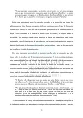 “O sea, una mujer con una mujer o un hombre con un hombre ¡Ay no!, pero se respeta pues, es que tenemos derechos cada quien, igual si son hombres y hombres y se gustan y se quieren, pues se respeta, es su derecho, tienen derecho a defender lo que quieren. Y yo decido que me gustan los hombres y no me gustan las mujeres” (Marta) Existe una ambivalencia entre los derechos sexuales y la percepción que tienen los adolescentes de ellos. En esta percepción, influyen cuestiones como el tipo de formación recibida en la familia, así como otro tipo de actitudes aprehendidas en un ambiente externo al hogar. Todos coinciden en el derecho a decidir sobre su cuerpo y al respeto sobre su sexualidad, sin embargo, cuando estos derechos se hacen más específicos para ciertas necesidades como la interrupción de un embarazo o el acceso a anticonceptivos, surge un habitus clasificatorio de los mismos de acuerdo a sus necesidades y todo un discurso social que penaliza el ejercicio de estos derechos. Otro tema importante que se abordó en las entrevistas fue sobre la concepción que ellos tienen sobre el derecho a decir de las mujeres sobre su cuerpo. El aborto continúa siendo para ellos, específicamente para las mujeres, un tema delicado y sensible. Esto se encuentra en opiniones que rechazan el derecho de las mujeres a decidir por su propio cuerpo. Los preceptos morales en torno a este tema juegan un papel fundamental en esta percepción que tienen hacia la interrupción voluntaria del embarazo. Los adolescentes entrevistados en su mayoría se oponen a la interrupción voluntaria del embarazo: “El derecho a la vida, porque tengo una amiga que quiso abortar y yo de que ¿cómo vas a hacer eso?, tu bebé tiene derecho a nacer, y sí al final ella sí lo tuvo, pero pues yo creo que ese es el derecho más importante, el derecho a la vida” (Rosa) “Por qué, porque le estás quitando el derecho a una vida, lo cual a ti no te incum… no te… cómo se llama, no tienes el derecho, de… es un bebé que tiene que nacer, por algo pasó, y se me hace muy feo que vayan a matar a un bebé por un error que cometiste, ya es una responsabilidad, tuviste relaciones, te embarazaste, y ya si quedaste embarazada pues a afrontar las consecuencias” (Juan) En los testimonios de Rosa y Juan encontramos elementos de la paradójica concepción de la ciudadanía moderna, que por una parte, consigna a las mujeres al ámbito privado, y por otra 98