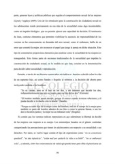 parte, generan leyes y políticas públicas que regulan el comportamiento sexual de las mujeres (Lynd y Argüeyo 2009). Uno de los obstáculos para la construcción de ciudadanía sexual en los adolescentes reside precisamente en esa idea de la sexualidad como algo incontrolable, como un impulso biológico que no permite ejercer una capacidad de decisión. El testimonio de Juan, contiene elementos que permiten visibilizar la ausencia de responsabilidad de los varones en las consecuencias no deseadas del acto sexual, como el embarazo; habla de un error que cometió la mujer, sin reconocer el papel que juega la pareja en dicha situación. Este tipo de comentarios proporciona elementos para analizar como la sexualidad de las mujeres es transgredida. Esto forma parte de nociones tradicionales de la sexualidad que impiden la construcción de ciudadanía sexual, en la medida en que ésta, consiste en la determinación para decidir sobre sexualidad y reproducción. Germán, a través de un discurso conservador reivindica su derecho a decidir sobre la vida de un supuesto hijo, así como Sandra y Rogelio al referirse a la decisión del aborto pero incluyendo también a los hombres: “Es su cuerpo, pero es el hijo de los dos, y ahí tenemos que decidir los dos, independientemente que sea su cuerpo, pero es hijo de los dos” (Germán) “El hombre también puede decidir, porque él estuvo cuando tuvieron relaciones y él puede decidir si lo aborta o no lo aborta” (Sandra) “Porque es tanto hijo de la mujer como del hombre, está en el cuerpo de la mujer pero también va parte del hombre adentro de ese feto o como le quieras llamar, o sea los dos lo hicieron juntos y la mujer no se embarazó sola” (Rogelio) Es común que los varones realicen expresiones en que subestimen la libertad de decidir de las mujeres con respecto a su cuerpo. Los estereotipos basados en el género continúan categorizando las percepciones que tienen los adolescentes con respecto a su sexualidad y sus derechos. Por tanto, se vuelve lugar común el tipo de expresiones como “en su conciencia quedará”, “es una injusticia”, “están mal por quitarle la vida a su bebé”, “no se embarazó sola”, y además, sobre las consecuencias de salud que puede tener para ellas el practicarse un 99