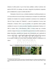 tolerancia al carbón parcial, lo que la hace buena candidata a utilizar el próximo ciclo agrícola (2014-2015), sin embargo, solo estaría a disposición de productores cooperantes para su multiplicación y no para su siembra aún (ibíd.). 101 Retomando el tema de la roya, no obstante actualmente el problema principal ya no es la roya de tallo sino la roya de la hoja, la resistencia que se incorporó a las semillas desde mediados de la década de los cuarenta ha mantenido la resistencia de las variedades del Valle del Yaqui al ataque del “Chahuixtle”, a pesar del surgimiento de nuevas razas (Valenzuela y Camacho, 2013), lo que ha permitido a los agricultores ahorrar grandes cantidades de recursos al no tener que aplicar fungicidas constantemente (Lantican et al. 2005, en Aquino, Peña y Ortiz-Monasterio, 2008). Al mismo tiempo que se buscaba controlar el ataque de la roya, con la obtención de generaciones de semillas mejoradas, las plantas desarrollaron capacidad para responder más eficientemente ante la aplicación de insumos como el agua; y aunque hubiera condiciones favorables para la roya la resistencia de las plantas al ataque de las razas locales ha permitido mantener el rendimiento de la cultivo. Figura 27. Problemática recurrente: roya de la hoja, roya de tallo y roya amarilla Fuente: Camacho, 2011. 101 Actualmente está en trámite su registro ante el Servicio Nacional de Inspección y Certificación de Semillas (SNICS), el cual es muy probable quede concluido éste año (Tribuna, 21 abril 2014; Tribuna, 17 mayo 2014; Noticias Cajeme, 10 abril 2014). 109