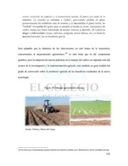 e es sc ca as so o c co on nt te en ni id do o d de e p pr ro ot te eí ín na a y y e el l c co on ns se ec cu ue en nt te e c ca as st ti ig go o a al l p pr re ec ci io o p po or r p pa ar rt te e d de e l la a i in nd du us st tr ri ia a. . L La a c co os se ec ch ha a s se e r re ea al li iz za ab ba a a a “ “p pa al lo os s” ”, , p pr ro ov vo oc ca an nd do o p pé ér rd di id da a d de e g gr ra an no o p po os st te er ri io or rm me en nt te e l la as s t tr ri il ll la ad do or ra as s e er ra an n d de e a ar rr ra as st tr re e y y s se e e en nc co os st ta al la ab ba a e el l g gr ra an no o a ar rr ri ib ba a, , l la as s “ “r re ec ci ib ba as s” ” ( (r re ec ce ep pc ci ió ón n d de el l g gr ra an no o p pa ar ra a s su u a ac co op pi io o) ) s se e h ha ac cí ía an n e en n s sa ac co os s. . L Lo os s c ca am mp po os s d de e c cu ul lt ti iv vo o t te en ní ía an n u un na a f fu ue er rt te e i in nf fe es st ta ac ci ió ón n d de e z za ac ca at te es s J Jo oh hn ns so on n y y a al lp pi is st ti il ll lo o. . E El l c co on nt tr ro ol l d de e p pl la ag ga as s y y e en nf fe er rm me ed da ad de es s ( (r ro oy ya as s, , c ca ar rb bo on ne es s, , p pu ul lg go on ne es s, , m mo os sc ca a b bl la an nc ca a, , e et tc c. .) ) s se e h ha ac cí ía a d de e m ma an ne er ra a i ir rr ra ac ci io on na al l, , s si in n u un n m mo on ni it to or re eo o p pr re ev vi io o. . Será palpable que la dinámica de las innovaciones en este tramo de la trayectoria, concernientes al mejoramiento agronómico, 105 es más lenta que la del componente genético, pues la adopción de nuevas prácticas en el manejo del cultivo no depende solo del avance de la investigación y la experimentación agrícola, sino también en gran medida del grado de convicción sobre el productor agrícola de los beneficios resultantes de la nueva tecnología. Figura 29. Manejo agronómico en trigo Fuente: Tribuna y Diario del Yaqui. 105 Se obvia que el mejoramiento genético durante este trayecto continúa con la liberación de nuevas variedades de trigo. 112