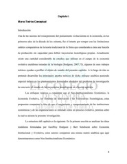 Capítulo I. Marco Teórico Conceptual Introducción Una de las razones del resurgimiento del pensamiento evolucionista en la economía, en los primeros años de la década de los ochenta, fue el intento por romper con las limitaciones estático comparativas de la teoría tradicional de la firma que consideraba a ésta una función de producción sin capacidad para definir trayectorias tecnológicas propias. Actualmente existe una cantidad considerable de estudios que utilizan en el campo de la economía evolutiva metáforas tomadas de la biología (Hodgson, 2007,75), algunos de esos trabajos teóricos ayudan a perfilar el objeto de estudio del presente capítulo. A lo largo de éste se pretende desarrollar los principales aportes teóricos de dicho enfoque analítico poniendo especial énfasis en los planteamientos formulados alrededor del problema de investigación de esta tesis: el estudio de las trayectorias tecnológicas en el sector agrícola. Los enfoques teóricos a considerar son el Neo-Institucionalismo Económico, la Economía Evolutiva, los Sistemas de Innovación y las Trayectorias Tecnológicas; estas propuestas comparten la idea de que el surgimiento y comportamiento de las instituciones económicas y de las organizaciones se entiende como un proceso evolutivo, premisa sobre la cual se asienta la presente investigación. La estructura del capítulo es la siguiente. En la primera sección se analizan las ideas medulares formuladas por Geoffrey Hodgson y Bart Noteboom sobre Economía Institucional y Evolutiva; estos autores comparten una misma matriz analítica que aquí denominaremos como Neo-Institucionalismo Económico. 8