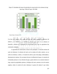 Figura 32. Resultados del ensayo de agricultura de conservación en los sistemas de trigo bajo riego, Valle del Yaqui, 1993-2006 Fuente: Sayre y Govaerts, 2013. Con base en lo anterior, en la región del Valle del Yaqui el equipo de agrónomos del INIFAP y del CIMMYT en el CENEB ha enfocado gran parte de sus esfuerzos al desarrollo y difusión de la agricultura de conservación, por lo que los agricultores han comenzado a adoptarla. La agricultura de conservación se basa en tres principios: 1) remoción mínima del suelo (sin labranza); 2) cobertura del suelo con los residuos del cultivo anterior, con un cultivo de cobertura, o ambos; y 3) rotación de cultivos, para evitar plagas, enfermedades y diseminación de malezas. De esa manera favorece la infiltración del agua y la retención de la humedad, promueve el uso eficiente del agua y genera ahorros en su consumo durante el riego, mejora las propiedades químicas y biológicas del suelo, aumenta el nivel de materia orgánica, reduce la erosión del suelo, disminuye la quema del rastrojo lo que reduce 117