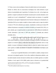 3.3 Viejos y nuevos retos tecnológicos: fuerzas de cambio técnico en el sector agrícola Durante los últimos años las innovaciones tecnológicas han venido abriendo un gran abanico de oportunidades para la agricultura. No obstante, hoy en día no hay alguna que garantice o asegure la producción de alimentos necesaria para la creciente demanda a nivel mundial, por lo que la sobrepoblación 141 continuará siendo una amenaza a la seguridad alimentaria, la cual según la Organización de las Naciones Unidas para la Alimentación y la Agricultura (FAO, por sus siglas en inglés) se alcanza cuando un país es capaz de producir al menos el 75% de los alimentos que consume. Actualmente se estima que al menos 870 millones de personas se encuentran en condición de hambre en el mundo (FAO, 2012) y se prevé, además, que se requerirá producir un aproximado de 1,000 millones de toneladas de cereales adicionales al año hasta el 2050 para satisfacer la demanda para entonces (FIAGRO, 2012). Por lo tanto, recordando que desde la década de los años 40 y 50, la urgencia de la lucha contra el hambre ya constituía un propulsor del progreso científico y tecnológico que propició la revolución verde, se puede decir que aunque se ha instituido como un viejo desafío, la escases de alimentos continuará siendo un motor de cambio técnico para el sector agrícola, en tanto sea necesario el desarrollo de innovaciones tecnológicas para responder a él. A la par que la seguridad alimentaria a nivel mundial se complica, emergen nuevos retos para la investigación agrícola. Uno de ellos, también de dimensiones globales y que ha estado tomando creciente relevancia los últimos años en el ámbito agrícola es el cambio climático, el cual, según la FAO (2009), podría causar un descenso en la productividad agrícola potencial global entre el 9% y el 21% en los países en desarrollo. 141 Para 2050, la población mundial rebasará los 9.6 mil millones. 138