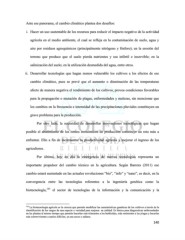 Ante ese panorama, el cambio climático plantea dos desafíos: i. Hacer un uso sustentable de los recursos para reducir el impacto negativo de la actividad agrícola en el medio ambiente, el cual se refleja en la contaminación de suelo, agua y aire por residuos agroquímicos (principalmente nitrógeno y fósforo); en la erosión del terreno que produce que el suelo pierda nutrientes y sea infértil e inservible; en la salinización del suelo; en la utilización desmedida del agua, entre otros. ii. Desarrollar tecnologías que hagan menos vulnerable los cultivos a los efectos de ese cambio climático, pues se prevé que el aumento o disminución de las temperaturas afecte de manera negativa el rendimiento de los cultivos, provea condiciones favorables para la propagación o mutación de plagas, enfermedades y malezas, sin mencionar que los cambios en la frecuencia e intensidad de las precipitaciones pluviales constituyen un grave problema para la producción. Por otro lado, la necesidad de desarrollar innovaciones tecnológicas que hagan posible el abatimiento de los costos económicos de producción constituye un reto más a enfrentar. Ello a fin de incrementar la productividad agrícola y mejorar el ingreso de los agricultores. Por último, hoy en día la emergencia de nuevas tecnologías representa un importante propulsor del cambio técnico en la agricultura. Según Barrera (2011) ese cambio estará sustentado en las actuales revoluciones “bio”, “info” y “nano”, es decir, en la convergencia entre las tecnologías referentes a la ingeniería genética como la biotecnología, 143 el sector de tecnologías de la información y la comunicación y la 143 La biotecnología agrícola es la ciencia que permite modificar las características genéticas de los cultivos a través de la identificación de los rasgos de una especie o variedad para mejorar su calidad. Es básica para diagnosticar enfermedades en las plantas al mismo tiempo que permite hacerlas más tolerantes a los herbicidas, más resistentes a las plagas y hacerlas más sobrevivientes a suelos difíciles, ya sea secos o salinos. 140