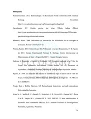 Bibliografía Actionbioscience. 2012. Biotecnología y la Revolución Verde. Entrevista al Dr. Norman Borlaug, Noviembre. http://www.actionbioscience.org/esp/biotecnologia/borlaug.html Agrosíntesis. S/f. Carbón parcial del trigo Tilletia indica (Mitra). http://www.agrosintesis.com/component/content/article/49-front-page/222-carbon- parcial-del-trigo-tilletia-indica-mitra Albornoz, Mario. 2009. Indicadores de innovación: las dificultades de un concepto en evolución. Revista CTS 13 (5): 9-25. Ammar, Karim. 2013. Entrevista por Iris Valenzuela y Alvaro Bracamonte, 14 de Agosto de 2013. Campo Experimental Norman E. Borlaug. Centro Internacional de Mejoramiento de Maíz y Trigo (CIMMYT). Ciudad Obregón, Sonora. Andrade, J. Francisco y Donald K. Freebairn.1965. Economía agrícola en el Valle del Yaqui. Los ejidatarios individuales. Folleto técnico No. 49, Secretaría de Agricultura y Ganadería. Instituto Nacional de Investigaciones Agrícolas, México. Aquino, P .1998. La adopción del método de siembra de trigo en surcos en el Valle del Yaqui, Sonora, México. Informe Especial del Programa de Trigo No. 17b. México, D.F.: CIMMYT. Araujo, Luis y Debbie Harrison. S/f. Technological trajectories and path dependence. Universidad de Lancaster. Arias, M. A., Mallén R. C., Garza R.D., Rentería A. J. B., Reyes M.L., Zamora M.P., Tovar G.M.R., Vargas M.S. y Gómez H. T. 2010. INIFAP: 25 años contribuyendo al desarrollo rural sustentable. México, D.F.: Instituto Nacional de Investigaciones Forestales, Agrícolas y Pecuarias. 154