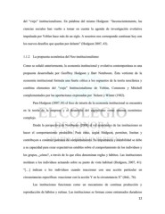 del “viejo” institucionalismo. En palabras del mismo Hodgson: “Inconscientemente, las ciencias sociales han vuelto a tomar en cuenta la agenda de investigación evolutiva impulsada por Veblen hace más de un siglo. A nosotros nos corresponde continuar hoy con los nuevos desafíos que quedan por delante” (Hodgson 2007, 43). 1.1.2 La propuesta económica del Neo-institucionalismo Como se señaló anteriormente, la economía institucional y evolutiva contemporánea es una propuesta desarrollada por Geoffrey Hodgson y Bart Noteboom. Ésta vertiente de la economía institucional formula una fuerte crítica a los supuestos de la teoría neoclásica y combina elementos del “viejo” Institucionalismo de Veblen, Commons y Mitchell complementados por las aportaciones expresadas por Nelson y Winter (1982). Para Hodgson (2007,10) el foco de interés de la economía institucional se encuentra en la teoría de la empresa y el desarrollo del capitalismo como sistema económico complejo. Desde la perspectiva de Noteboom (2000) el rol económico de las instituciones es hacer el comportamiento predecible. Pues éstas, según Hodgson, permiten, limitan y contribuyen a construir patrones de comportamiento. Su importancia y durabilidad se debe a su capacidad para crear expectativas estables sobre el comportamiento de los individuos y los grupos, ¿cómo?, a través de lo que ellos denominan reglas y hábitos. Las instituciones moldean a los individuos actuando sobre su punto de vista habitual (Hodgson, 2007, 41): “[…] indican a los individuos cuando reaccionar con una acción particular en circunstancias específicas: reaccionar con la acción Y en la circunstancia X” (ibíd., 76). Las instituciones funcionan como un mecanismo de continua producción y reproducción de hábitos y rutinas. Las instituciones se forman como entramados duraderos 12