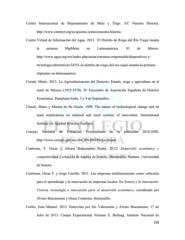Centro Internacional de Mejoramiento de Maíz y Trigo. S/f. Nuestra Historia. http://www.cimmyt.org/es/quienes-somos/nuestra-historia Centro Virtual de Información del Agua. 2013. El Distrito de Riego del Río Yaqui instala la primera SlipMeter en Latinoamérica. 01 de febrero. http://www.agua.org.mx/index.php/actua/consumo-responsable/dispositivos-y- tecnologia-alternativas/24351-el-distrito-de-riego-del-rio-yaqui-instala-la-primera- slipmeter-en-latinoamerica Cerutti, Mario. 2013. La Agriculturizacion del Desierto. Estado, riego y agricultura en el norte de México (1925-1970). IV Encuentro de Asociación Española de Historia Económica. Pamplona-Iruña. 3 y 4 de Septiembre. Cimoli, Mario y Marina de lla Giusta. 1998. The nature of technological change and its main implications on national and local systems of innovation. International Institute for Applied Systems Analysis. Consejo Nacional de Población. Proyecciones de la población 2010-2050. http://www.conapo.gob.mx/es/CONAPO/Proyecciones Contreras, F. Oscar y Alvaro Bracamonte Sierra. 2012. Desarrollo económico y competitividad y creación de empleo en Sonora, Hermosillo: Pearson, Universidad de Sonora. Contreras, Oscar F. y Jorge Carrillo. 2011. Las empresas multinacionales como vehículos para el aprendizaje y la innovación en empresas locales. En Sonora y la innovación. Ciencia, tecnología e innovación para el desarrollo económico, coordinado por Álvaro Bracamonte y Oscar Contreras. Hermosillo. Cortés, Juan Manuel. 2013. Entrevista por Iris Valenzuela y Alvaro Bracamonte, 17 de Julio de 2013. Campo Experimental Norman E. Borlaug. Instituto Nacional de 158