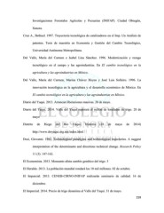 Investigaciones Forestales Agrícolas y Pecuarias (INIFAP). Ciudad Obregón, Sonora. Cruz A., Bethuel. 1997. Trayectoria tecnológica de catalizadores en el Imp. Un Análisis de patentes. Tesis de maestría en Economía y Gestión del Cambio Tecnológico, Universidad Autónoma Metropolitana. Del Valle, María del Carmen e Isabel Lina Sánchez. 1996. Modernización y rezago tecnológico en el campo y las agroindustrias. En El cambio tecnológico en la agricultura y las agroindustrias en México. Del Valle, María del Carmen, Marina Chávez Hoyos y José Luis Solleiro. 1996. La innovación tecnológica en la agricultura y el desarrollo económico de México. En El cambio tecnológico en la agricultura y las agroindustrias en México. Diario del Yaqui. 2013. Arrancan liberaciones masivas. 20 de mayo. Diario del Yaqui. 2014. Valle del Yaqui superará el millón de toneladas de trigo. 28 de mayo Distrito de Riego del Río Yaqui. Historia (16 de mayo de 2014) http://www.drryaqui.org.mx/index.html Dosi, Giovanni. 1982. Technological paradigms and technological trajectories. A suggest interpretation of the determinants and directions technical change. Research Policy 11 (3): 147-162. El Economista. 2013. Monsanto alista cambio genético del trigo. 3 El Heraldo. 2013. La población mundial rondará los 10 mil millones. 02 de octubre. El Imparcial. 2013. CENEB-CIRNO-INIFAP realizarán seminario de calidad. 16 de diciembre. El Imparcial. 2014. Precio de trigo desanima al Valle del Yaqui. 31 de mayo. 159