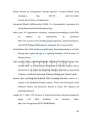 Instituto Nacional de Investigaciones Forestales Agrícolas y Pecuarias INIFAP. Fichas tecnológicas trigo 2002-2011. http://www.inifap- noroeste.gob.mx/fichas_tecnologicas.aspx International Wheath Yield Partnership (IWYP). 2014. Comunicado del Lanzamiento de la Alianza Internacional de Rendimiento de Trigo. Jardon, Juan J. S/f. Organizaciones económicas y su trayectoria tecnológica y social (TTS). La dinámica del mantenimiento de permanecer. http://www.econ.uba.ar/www/institutos/epistemologia/marco_archivos/ponencias/A ctas%20XIII/Trabajos%20Episte/jardon_trabajo.pdf (09 de mayo de 2013). Joachim Braun, Hans. 2014. Borlaug´s scientific legacy. Ponencia presentada en la Cumbre Borlaug sobre el papel del trigo en la seguridad alimentaria, 25-28 de marzo, Cd. Obregón, Sonora. Joglar Espinosa, Hernán, Julián Chaparro Peláez, Alejandro Orero Giménez y Sergio Araya Guzmán. 2007. Los Antecedentes de la Capacidad de Absorción: Análisis Crítico y Proposición de un Modelo de Integración. Ponencia presentada en International Conference on Industrial Engineering & Industrial Management, Madrid, España. Johnson, Bjorn and Bengt-Ake Lundvall. 2000. Promoting innovation systems as a response to the globalizing learning economy, Second Draft to the project Local Productive Clusters and Innovations Systems in Brazil: New industrial and technological policies. Labrada, R y C. Parker. 1996. El control de malezas en el contexto del manejo integrado de plagas. FAO Plant Production and Protection Papers. http://www.fao.org/docrep/T1147S/T1147S00.htm 162