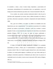 de costumbres y rutinas y éstas al mismo tiempo, depositarias y preservadoras del conocimiento, primordialmente del conocimiento tácito, son reproducidas a través del tiempo por las mismas instituciones que actúan como “correas de transmisión” (ibíd., 69). En ese sentido, esta corriente económica institucional admite la idea de que los individuos están “programados” por normas, valores y hábitos incrustados en la cultura, lo que limita y direcciona su percepción, evaluación e interpretación del mundo (Noteboom, 2000). Pero, ¿qué son los hábitos y las reglas?. Los hábitos son entendidos más como 5 disposiciones que como comportamientos . Son repertorios inconscientes de la conducta potencial, que pueden ser provocados o reforzados a partir de un estímulo o contexto apropiado. Es decir, son una propensión para comportarse de cierta forma en una situación particular (Hodgson, 2007). Por su parte, las reglas son pautas condicionales o incondicionales del pensamiento y la conducta que los agentes pueden adoptar consciente o inconscientemente (ibíd., 76); cuando los hábitos se vuelven parte común de un grupo o una cultura social, se vuelven rutinas o costumbres (Commons, 1934 citado en Hodgson, 2007, 69). El hábito y la rutina del enfoque institucional se adecuan a los postulados desarrollados por Nelson y Winter, pues “el institucionalismo es congénitamente una economía evolutiva” (ibíd., 61). Cuando los agentes intentan llevar a cabo ciertas mejoras, los hábitos o las rutinas pueden adaptarse o modificarse, por lo que Veblen señala que el paradigma evolucionista proporciona el fundamento para abarcar tanto los procesos de continuidad como los de cambio, la inercia como la innovación (1899, citado en Hodgson, 2007, 61). 5 Si se adquiere un hábito no necesariamente se pone en práctica todo el tiempo. 13