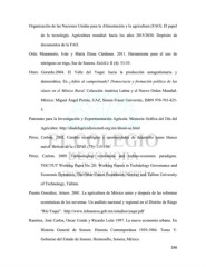Organización de las Naciones Unidas para la Alimentación y la agricultura (FAO). El papel de la tecnología. Agricultura mundial: hacia los años 2015/2030. Depósito de documentos de la FAO. Ortiz Monasterio, Iván y María Elena Cárdenas. 2011. Herramienta para el uso de nitrógeno en trigo, Sur de Sonora. EnlACe II (4): 53-55. Otero Gerardo.2004. El Valle del Yaqui: hacia la producción autogestionaria y democrática. En ¿Adiós al campesinado? Democracia y formación política de las clases en el México Rural. Colección América Latina y el Nuevo Orden Mundial. México: Miguel Ángel Porrúa, UAZ, Simon Fraser University, ISBN 970-701-425- 3. Patronato para la Investigación y Experimentación Agrícola. Memoria Gráfica del Día del Agricultor. http://diadelagricultorceneb.org.mx/about-us.html Pérez, Carlota. 2001. Cambio tecnológico y oportunidades de desarrollo como blanco móvil. Revista de la CEPAL (75): 115-136. Pérez, Carlota. 2009. Technological revolutions and techno-economic paradigms. TOC/TUT Working Paper No. 20. Working Papers in Technology Governance and Economic Dynamics, The Other Canon Foundation, Norway and Tallinn University of Technology, Tallinn. Puente González, Arturo. 2001. La agricultura de México antes y después de las reformas económicas de los noventas. Un análisis nacional y regional en el Distrito de Riego “Río Yaqui”. http://www.infoaserca.gob.mx/estudios/yaqui.pdf Ramírez, José Carlos, Oscar Conde y Ricardo León 1997. La nueva economía urbana. En Historia General de Sonora. Historia Contemporánea 1929-1984. Tomo V. Gobierno del Estado de Sonora. Hermosillo, Sonora, México. 166