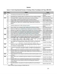 Anexos Anexo 1. Centro Experimental Norman. E. Borlaug. Fichas Tecnológicas del Trigo, 2002-2011. Año Clave Título Autor 2011 Juan Manuel Cortés 205 Tecnología para la producción de trigo orgánico Jiménez 212 Metodología para cuantificar daños a la producción de trigo causado por heladas Pedro Félix Valencia 2010 176 Villa Juárez F2009: variedad de trigo harinero para el noroeste de México Valenzuela Herrera Víctor 177 Onavas F2009: variedad de trigo harinero para el noroeste de México Figueroa López Pedro 181 Tepahui F2009: nueva variedad de trigo harinero para el noroeste de México Chávez Villalba Gabriela Huatabampo oro C2009: nueva variedad de trigo cristalino para el noroeste de 182 Fuentes Dávila Guillermo México Cortes Jiménez Juan 185 Labranza mínima para el cultivo de trigo en surcos Manuel 188 Movas C2009: nueva variedad de trigo cristalino para el noroeste de México Félix Fuentes José Luis 2009 160 Sáwali oro C2008: nueva variedad de trigo cristalino para el noroeste de México Figueroa López Pedro 161 Patronato oro C2008: nueva variedad de trigo cristalino para el noroeste de México Chávez Villalba Gabriela 164 Cevy oro C2008: nueva variedad de trigo cristalino para el noroeste de México Fuentes Dávila Guillermo 168 Cirno C2008: nueva variedad de trigo cristalino para el noroeste de México Félix Fuentes José Luis 2008 148 Modelo de pronóstico para la cosecha del cultivo de trigo en el estado de Sonora Félix Valencia Pedro 151 Navojoa M2007: nueva variedad de trigo harinero para el noroeste de México Figueroa López Pedro 152 Roelfs F2007: nueva variedad de trigo harinero para el noroeste de México Figueroa López Pedro 2007 Cortes Jiménez Juan 137 Uso de labranza reducida para la siembra de trigo en surcos Manuel Átil C2000: nueva variedad de trigo cristalino para su cultivo en el noroeste de 138 Camacho Casas Miguel México 2006 Banámichi C2004: nueva variedad de trigo cristalino para el noroeste de México 116 Camacho Casas Miguel con resistencia a la roya de la hoja 2005 Labranza de conservación: una opción rentable y sostenible en la producción de Valenzuela Borbón J. 91 trigo Rafael 93 Kronstad F2004, nueva variedad de trigo harinero para el noroeste de México Camacho Casas Miguel Samayoa C2004: nueva variedad de trigo cristalino para el noroeste de México con 104 Figueroa López Pedro resistencia a la roya de la hoja 2003 Trigo: producción con dos riegos de auxilio bajo suelos de aluvión pesado en el sur 42 Ortiz Enríquez José Eliseo de Sonora 2002 Júpare C2001, nueva variedad de trigo duro resistente a la roya de la hoja para el 25 Camacho Casas Miguel noroeste 26 Tacupeto F2001, nueva variedad de trigo harinero para el noroeste de México Camacho Casas Miguel Trigo: producción con dos riegos de auxilio una tecnología para enfrentar la 28 Ortiz Enríquez José Eliseo escasez de agua El combate químico: una opción en el control de epifitias de roya de la hoja en 29 Figueroa López Pedro trigo Fuente: INIFAP, Fichas tecnológicas CENEB 2002-2011 171