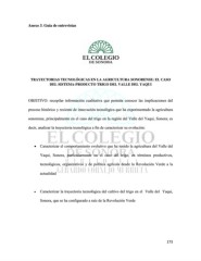 Anexo 3. Guía de entrevistas TRAYECTORIAS TECNOLÓGICAS EN LA AGRICULTURA SONORENSE: EL CASO DEL SISTEMA-PRODUCTO TRIGO DEL VALLE DEL YAQUI OBJETIVO: recopilar información cualitativa que permita conocer las implicaciones del proceso histórico y reciente de innovación tecnológica que ha experimentado la agricultura sonorense, principalmente en el caso del trigo en la región del Valle del Yaqui, Sonora; es decir, analizar la trayectoria tecnológica a fin de caracterizar su evolución: Caracterizar el comportamiento evolutivo que ha tenido la agricultura del Valle del Yaqui, Sonora, particularmente en el caso del trigo, en términos productivos, tecnológicos, organizativos y de política agrícola desde la Revolución Verde a la actualidad Caracterizar la trayectoria tecnológica del cultivo del trigo en el Valle del Yaqui, Sonora, que se ha configurado a raíz de la Revolución Verde 173