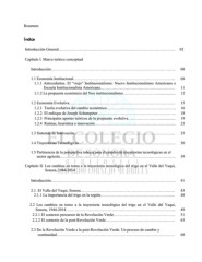 Resumen Índice Introducción General…………………………………………………………………………….. 02 Capítulo I. Marco teórico conceptual Introducción………………………………………………………………………………….. 08 1.1 Economía Institucional…………………………………………………………………... 09 1.1.1 Antecedentes. El “viejo” Institucionalismo: Nuevo Institucionalismo Americano o Escuela Institucionalista Americana………………………………………………… 11 1.1.2 La propuesta económica del Neo institucionalismo………………………................. 12 1.2 Economía Evolutiva……………………………………………………………………... 15 1.2.1 Teoría evolutiva del cambio económico…………………………………………….. 16 1.2.2 El enfoque de Joseph Schumpeter ………………………………………………….. 18 1.2.3 Principales aportes teóricos de la propuesta evolutiva……………………................ 19 1.2.4 Rutinas, heurística e innovación…………………………………………………...... 23 1.3 Sistemas de Innovación………………………………………………………………….. 25 1.4 Trayectorias Tecnológicas……………………………………………………………….. 30 1.5 Pertinencia de la perspectiva teórica para el estudio de trayectorias tecnológicas en el sector agrícola……………………………………………………………………………. 39 Capítulo II. Los cambios en torno a la trayectoria tecnológica del trigo en el Valle del Yaqui, Sonora, 1944-2014 Introducción………………………………………………………………………………….. 41 2.1. El Valle del Yaqui, Sonora……………………………………………………………… 43 2.1.1 La importancia del trigo en la región……………………………………………....... 48 2.2 Los cambios en torno a la trayectoria tecnológica del trigo en el Valle del Yaqui, Sonora, 1944-2014………………………………………………………………………... 49 2.2.1 El contexto precursor de la Revolución Verde……………………………………….. 51 2.2.2 El contexto de la post-Revolución Verde…………………………………………….. 63 2.3 De la Revolución Verde a la post-Revolución Verde. Un proceso de cambio y continuidad……………………………………………………………………………… 68 1