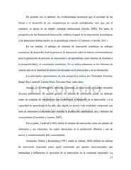 De acuerdo con lo anterior, los evolucionistas reconocen que el accionar de las firmas y el desarrollo de sus competencias no sucede aisladamente, sino que, por el contrario, se apoya en un amplio complejo institucional (Zavala, 2004). Por tanto, la perspectiva de los Sistemas de Innovación, enfatiza el papel de las trayectorias tecnológicas y las dotaciones institucionales en el aprendizaje colectivo (Contreras y Carrillo, 2011). En ese sentido, el enfoque de sistemas de innovación constituye un enfoque económico de desarrollo local al promover la interacción entre los actores socioeconómicos para la generación de procesos de innovación y de aprendizaje como factores de fomento a la competitividad y el crecimiento económico. No se enfoca solamente en los oferentes de ciencia sino en la totalidad de actores involucrados en la innovación y en su interacción. Los principales representantes de ésta perspectiva teórica son Chistopher Freeman, Bengt-Åke Lundvall, Carlota Pérez, Giovanni Dosi, entre otros. Aunque en la bibliografía referente a sistemas de innovación se pueden encontrar diversas definiciones, de manera general, un sistema de innovación puede ser definido como un conjunto de instituciones que contribuyen al desarrollo de la innovación y a la capacidad de aprendizaje de un país, una región, un sector o una localidad; comprende una serie de elementos y relaciones que vinculan la producción, asimilación, uso y difusión del conocimiento (Cassiolato y Lastres, 2007). Por su parte, Lundvall (1992) define al sistema de innovación como un número de elementos y sus relaciones, los cuales interactúan en la producción, difusión y uso de nuevo, y económicamente útil, conocimiento. Asimismo, Nelson y Rosemberg (1993, citado en Zabala, 2004) definen un sistema de innovación (nacional) como aquél constituido por agentes interconectados que interactúan e influencian la ejecución de la innovación en la economía (nacional). La 27