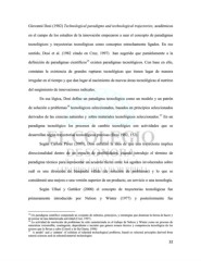 Giovanni Dosi (1982) Technological paradigms and technological trajectories, académicos en el campo de los estudios de la innovación empezaron a usar el concepto de paradigmas tecnológicos y trayectorias tecnológicas como conceptos estrechamente ligados. En ese sentido, Dosi et al. (1982 citado en Cruz, 1997) han sugerido que paralelamente a la 15 definición de paradigmas científicos existen paradigmas tecnológicos. Con base en ello, constatan la existencia de grandes rupturas tecnológicas que tienen lugar de manera irregular en el tiempo y que dan lugar al nacimiento de nuevas áreas tecnológicas al nutrirse del surgimiento de innovaciones radicales. En esa lógica, Dosi define un paradigma tecnológico como un modelo y un patrón 16 de solución a problemas tecnológicos seleccionados, basados en principios seleccionados 17 derivados de las ciencias naturales y sobre materiales tecnológicos seleccionados. En un paradigma tecnológico los procesos de cambio tecnológico son actividades que se desarrollan según trayectorias tecnológicas precisas (Dosi 1982, 152). Según Carlota Pérez (2009), Dosi enfatizó la idea de que una trayectoria implica direccionalidad dentro de un espacio de posibilidades, cuando introdujo el término de paradigma técnico para representar un acuerdo tácito entre los agentes involucrados sobre cuál es una dirección de búsqueda válida (de solución de problemas) y lo que se considerará una mejora o una versión superior de un producto, un servicio o una tecnología. Según Ulhøi y Gattiker (2000) el concepto de trayectorias tecnológicas fue primeramente introducido por Nelson y Winter (1977) y posteriormente fue 15 Un paradigma científico comprende un conjunto de métodos, principios, y estrategias que dominan la forma de hacer y de pensar de una determinada actividad (Cruz, 1997). 16 La actividad de resolución de problemas ha sido caracterizada en el trabajo de Nelson y Winter como un proceso de naturaleza irreversible, contingente, dependiente e incierto que genera avance técnico y competencia tecnológica de los actores que lo llevan a cabo (Cimoli y de lla Giusta, 1998) 17 A model’ and a ‘pattern’ of solution of selected technological problems, based on selected principles derived from natural sciences and on selected material technologies 32