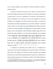 otro se encuentra supeditada en gran medida por el ambiente institucional, económico y social prevaleciente. Al igual que un sistema de innovación, como se señaló en la sección anterior, las trayectorias tecnológicas representan un proceso dinámico cuya evolución es gobernada por 18 su propia historia, es decir que es dependiente de la trayectoria (path dependent). La noción de dependencia de la trayectoria como marco para comprender las trayectorias tecnológicas se ha desplegado en la historia económica para explicar las secuencias de acontecimientos relacionados principalmente con la evolución tecnológica e institucional (Araujo y Harrison, s/f). De acuerdo a esa noción, Rosenberg (1994) señala que la forma y la dirección del cambio tecnológico es influenciada por la sucesión particular de eventos pasados, es decir, como señala Dosi (1982, 1988 citado en Bathelt y Boggs, 2005), que la dirección del cambio tecnológico es en cierto grado pre-estructurada por las tecnologías existentes, aunque no de una manera determinista. De esa manera, la historia del desarrollo de nuevas tecnologías y de la adaptación de las ya existentes define una trayectoria tecnológica particular. A lo largo de este camino, según Nelson (1995 citado en Bathelt y Boggs, 2005), las empresas acumulan conocimientos especializados sobre tecnologías específicas y sus usos. La producción de conocimiento tácito también actúa en la configuración de trayectorias en formas fuertemente dependientes de la trayectoria (Zysman, 1994, citado en Gertler, 2005). Ello significa que la dirección del cambio tecnológico está conformada fuertemente por las experiencias de aprendizaje pasadas, las prácticas y las relaciones de los actores económicos envueltos en él. En relación a esto último, Gertler (2005) señala que el 18 La noción de dependencia de la trayectoria en las ciencias sociales ha sido ampliamente desarrollada por economistas preocupados por la evolución de la tecnología y las instituciones, y ha servido en parte como una plataforma para restablecer la "historia" de nuevo en la teoría económica (Araujo y Harrison, s/f). 34