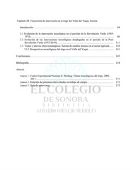 Capítulo III. Trayectoria de innovación en el trigo del Valle del Yaqui, Sonora Introducción………………………………………………………………………………….. 84 3.1 Evolución de la innovación tecnológica en el periodo de la Revolución Verde (1945- 1974)…………………………………………………………………………………….. 86 3.2 Evolución de las innovaciones tecnológicas desplegadas en el periodo de la Post- Revolución Verde (1975-2014)…………………………………………………………. 111 3.3 Viejos y nuevos retos tecnológicos: fuerzas de cambio técnico en el sector agrícola…... 138 3.3.1 Prospectivas tecnológicas del trigo en el Valle del Yaqui…………........................ 141 Conclusiones……………………………………………………………………………………... 145 Bibliografía………………………………………………………………………………………. 154 Anexos Anexo 1. Centro Experimental Norman E. Borlaug. Fichas tecnológicas del trigo, 2002- 2011………………………………………………………………………………. 171 Anexo 2. Relación de personas entrevistadas en trabajo de campo…………………………. 172 Anexo 3. Guía de entrevistas……………………………………………………………....... 173 2