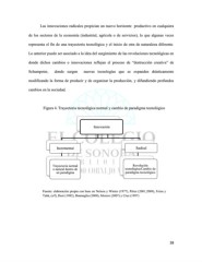 Las innovaciones radicales propician un nuevo horizonte productivo en cualquiera de los sectores de la economía (industrial, agrícola o de servicios), lo que algunas veces representa el fin de una trayectoria tecnológica y el inicio de otra de naturaleza diferente. Lo anterior puede ser asociado a la idea del surgimiento de las revoluciones tecnológicas en donde dichos cambios o innovaciones reflejan el proceso de “destrucción creativa” de Schumpeter, donde surgen nuevas tecnologías que se expanden drásticamente modificando la forma de producir y de organizar la producción, y difundiendo profundos cambios en la sociedad. Figura 4. Trayectoria tecnológica normal y cambio de paradigma tecnológico Innovación Incremental Radical Trayectoria normal Revolución o natural dentro de tecnológica/Cambio de un paradigma paradigma tecnológico Fuente: elaboración propia con base en Nelson y Winter (1977), Pérez (2001,2009), Feixa y Tañá, (s/f), Dosi (1982), Bramuglia (2000), Morero (2007) y Cruz (1997) 38