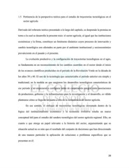 1.5 Pertinencia de la perspectiva teórica para el estudio de trayectorias tecnológicas en el sector agrícola Derivado del referente teórico presentado a lo largo del capítulo, se desprende la premisa en torno a la cual se desarrolla la presente tesis: el sector agrícola, al igual que las instituciones económicas y la firma, constituye un fenómeno dinámico cuyos procesos de innovación y cambio tecnológico son afectados en parte por el ambiente institucional y socioeconómico prevaleciente en el pasado y el presente. La evolución productiva y la configuración de trayectorias tecnológicas en el agro, se fundamenta en un reconocimiento de los cambios ocurridos en el sector desde el inicio de los avances científicos producidos en el periodo de la Revolución Verde en la década de los años 50 y 60. El uso de la tecnología que caracterizaba el periodo anterior era simple y tradicional; en la medida en que surgieron los desarrollos tecnológicos característicos de ese periodo y se empezaron a configurar redes de cooperación integral entre asociaciones de productores, gobierno y la infraestructura para la investigación y el desarrollo, es válido plantearse cómo se llega de un punto a otro en la competencia del sector agrícola. En ese sentido, el enfoque de trayectorias tecnológicas incrustado dentro de la lógica del institucionalismo económico y la economía evolutiva resulta un marco conceptual útil para el estudio del sendero tecnológico del sector agrícola regional. Ello, en cuanto a que otorga un papel relevante a la historia del sector, argumentando que su situación actual no es más que el resultado del conjunto de decisiones que han direccionado de una manera particular la aplicación de soluciones a problemas específicos que se presentan en él. 39