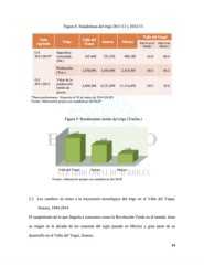 Figura 8. Estadísticas del trigo 2011/12 y 2012/13 Valle del Yaqui Ciclo Trigo Valle del Sonora México Agrícola Yaqui Part.% en el Part.% en Estado México O-I Superficie 2013-2014* cosechada 165,448 251,526 409,189 65.8 40.4 (Ha.) Producción 2,418,505 68.4 (Ton.) 1,070,096 1,564,996 44.2 O-I Valor de la 2011-2012 producción 4,400,204 6,331,099 11,114,439 69.5 (miles de 39.6 pesos) *Datos preliminares. Situación al 30 de mayo de 2014 (SIAP) Fuente: elaboración propia con estadísticas del SIAP Figura 9. Rendimiento medio del trigo (Ton/ha.) 6.47 6.22 5.91 Valle del Yaqui Sonora México Fuente: elaboración propia con estadísticas del SIAP 2.2 Los cambios en torno a la trayectoria tecnológica del trigo en el Valle del Yaqui, Sonora, 1944-2014 El surgimiento de lo que llegaría a conocerse como la Revolución Verde en el mundo, tiene su origen en la década de los cuarenta del siglo pasado en México y gran parte de su desarrollo en el Valle del Yaqui, Sonora. 49