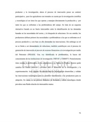 productor y la investigación, ahora el proceso de innovación posee un carácter participativo, pues los agricultores son tomados en cuenta por la investigación científica y tecnológica al ser éstos los que operan y manejan directamente la producción y por tanto los que se enfrentan a las problemáticas del campo. Se trata de un esquema interactivo basado en un fuerte intercambio entre la identificación de las demandas basadas en las necesidades del sector, y la búsqueda de soluciones. En ese sentido, los productores definen primero las necesidades o problemáticas a las que se enfrentan en el proceso productivo y con base en ello demandan las innovaciones. Sin embargo su rol no se limita a ser demandantes de soluciones, también contribuyen con el proceso de generación de innovación al proveer de recursos financieros a la investigación por medio del Patronato (PIEAES). Una vez identificada la problemática, la hacen del conocimiento de las instituciones de investigación: INIFAP y CIMMYT. Posteriormente éstas escalan la problemática de los productores a la Fundación Produce Sonora quién canaliza los fondos públicos y privados para el desarrollo de la investigación y la experimentación. Acto seguido las instituciones de investigación desarrollan y validan las innovaciones tecnológicas para su posterior transferencia a los productores para su adopción. En suma, es un proceso dinámico de demanda y oferta tecnológica donde prevalece una fluida relación de intercambio mutuo. 71