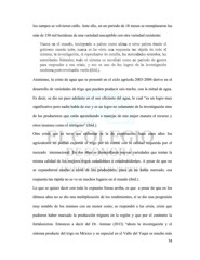 los campos se volvieron cafés. Ante ello, en un periodo de 18 meses se reemplazaron las más de 150 mil hectáreas de una variedad susceptible con otra variedad resistente: N Nu un nc ca a e en n e el l m mu un nd do o, , i in nc cl lu uy ye en nd do o a a p pa aí ís se es s c co om mo o c ch hi in na a u u o ot tr ro os s p pa aí ís se es s d do on nd de e e el l g go ob bi ie er rn no o m ma an nd da a t to od do o, , n nu un nc ca a s se e h ha a v vi is st to o u un na a r re es sp pu ue es st ta a t ta an n r rá áp pi id da a d de e t to od do o e el l s si is st te em ma a; ; l la a i in nv ve es st ti ig ga ac ci ió ón n, , e el l r re ep pr ro od du uc ct to or r d de e s se em mi il ll la a, , l la as s a au ut to or ri id da ad de es s e es st ta at ta al le es s, , l la as s a au ut to or ri id da ad de es s f fe ed de er ra al le es s; ; t to od do o e el l s si is st te em ma a s se e m mo ov vi il li iz zó ó c co om mo o e en n p pe er ri io od do o d de e g gu ue er rr ra a p pa ar ra a r re es sp po on nd de er r a a e es sa a c cr ri is si is s; ; y y e es so o e es s u un no o d de e l lo os s l lo og gr ro os s d de e l la a i in nv ve es st ti ig ga ac ci ió ón n m mo od de er rn na a p po os st t- -r re ev vo ol lu uc ci ió ón n v ve er rd de e ( (i ib bí íd d. .) ). . Asimismo, la crisis de agua que se presentó en el ciclo agrícola 2003-2004 derivo en el desarrollo de variedades de trigo que pueden producir seis ton/ha. con la mitad de agua. Es decir, se dio un paso adelante en el uso eficiente del agua, lo cual “es un logro muy significativo pero nadie habla de eso y es un logro no solamente de la investigación sino de los productores que están aprendiendo a manejar de una mejor manera el recurso y otros insumos como el nitrógeno” (ibíd.). Otra crisis que se tuvo que enfrentar es la de exportación; hace unos años los agricultores no podían exportar el trigo por no contar con la calidad requerida por el mercado internacional. En dos años se desarrollaron nuevas variedades que tenían la misma calidad de los mejores trigos canadienses o estadounidenses. A pesar de que no se expandieron mucho a nivel de los productores, pues ya no había mercado, esa respuesta tan rápida no se ve en muchos lugares en el mundo (ibíd.). Lo que se quiere decir con todo lo expuesto líneas arriba, es que a pesar de que en los últimos años no se dio una multiplicación de los rendimientos, sí se dio una progresión muy notable de los mismos con un menor costo; se respondió a las crisis, crisis que pudieron haber marcado la producción triguera en la región y que por el contrario la fortalecieron. Entonces a decir del Dr. Ammar (2013) “ahora la investigación y el sistema producto del trigo en México y en especial en el Valle del Yaqui es mucho más 74