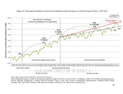 Figura 18. Trayectoria tecnológica. Evolución del rendimiento medio del trigo en el Valle del Yaqui (ton/ha.), 1935-2014. Se quintuplicará cuando llegue a 7.5 8.00 Revolución Tecnológica Cambio de paradigma en la agricultura 2011/12 y 2012/13:: 7.13 y 7.10 Aportaciones a la productividad. Rendimiento Ton/Ha. 7.00 1998: Se cuadriplica 6.00 6.00 6.47 1974: 6.30 Se triplica 4.58 5.00 1964: Se duplica 4.00 3.50 3.00 2.00 1.50 1.00 Periodo de optimización inicial Innovaciones incrementales 0.00 1935 1938 1939 1940 1941 1942 1943 1944 1949 1950 1951 1952 1953 1954 1955 1956 1957 1958 1959 1960 1961 1962 1963 1964 1965 1966 1967 1968 1969 1970 1971 1972 1973 1974 1975 1976 1977 1978 1979 1980 1981 1982 1983 1984 1985 1986 1987 1988 1989 1990 1991 1992 1993 1994 1995 1996 1997 1998 1999 2000 2001 2002 2003 2004 2005 2006 2007 2008 2009 2010 2011 2012 2013 2014 Innovación radical Sucesión de Innovaciones Periodo de 30 años Periodo de 40 años Nota: 1944= ciclo O-I 1943-1944;2014= ciclo O-I 2013-2014, etc. Fuente: Elaboración propia con datos de los Informes estadísticos anuales de la S.R.H. y de la S.A.R.H., en Margulis y Gibert, 1978; SARH, representación Sonora, Plan de Desarrollo Agropecuario y Forestal 1982-88 en Ramírez, Conde y León, 1997; Servicio de Información Agroalimentaria y Pesquera (SIAP); Puente González, 2001; Otero, 2004; Vietmeyer, 2009; Hewitt de Alcántara, 1988; Sayre, et al., 2006 citado en Camacho 2011; 78