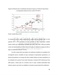 Figura 20. Relación entre el rendimiento del grano de trigo en el Valle del Yaqui Sonora y la temperatura mínima de enero a abril (1979-2013) Fuente: Joachim Braun, 2014. No obstante, si bien los datos presentados en la gráfica de arriba muestran que los ciclos agrícolas 2012 y 2013 presentaron un buen promedio de bajas temperaturas, también resulta evidente que históricamente ha habido años (2001, 2002, 2007, 2008) que también se han visto beneficiados por el factor clima en la región, no obstante en ninguno de ellos se logró un rendimiento medio de 7 ton./ha. Con ello se quiere decir que aunado a las condiciones climáticas, los resultados de la investigación (nuevas variedades de trigo; tecnología de mejoramiento agronómico) y la destreza del productor en el manejo del cultivo también influyen de manera significativa en los resultados de la cosecha. No por nada Valenzuela y Camacho (2013) afirman que Cirno 2008 pasará a formar parte de la historia como la mejor variedad desarrollada hasta entonces, gracias a que entre sus cualidades se encuentra su gran potencial de rendimiento. 83