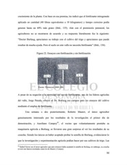 crecimiento de la planta. Con base en esa premisa, les indicó que el fertilizante nitrogenado aplicado en cantidad (40 libras equivalentes a 18 kilogramos) y tiempo correctos podía generar hasta un 60% más grano (ibíd., 135). Aún con el promisorio potencial, los agricultores no se mostraron de acuerdo y su respuesta literalmente fue la siguiente: “Doctor Borlaug, apreciamos su trabajo con el cultivo del trigo y apreciamos que puede resultar de mucha ayuda. Pero el suelo en este valle no necesita fertilizante” (ibíd., 136). Figura 22. Ensayos con fertilización y sin fertilización Fuente: Vietmeyer, 2009, 288. A pesar de su negación a la necesidad del uso de fertilizantes, uno de los líderes agrícolas del valle, Jorge Parada, ofreció al Dr. Borlaug sus campos para los ensayos del cultivo mediante el empleo de fertilizante. Una semana o dos posteriormente, Roberto Maurer, el único agricultor genuinamente interesado por los resultados de la investigación el primer día de 63 demostración, y Aureliano Campoy , el vecino que voluntariamente prestaba su maquinaria agrícola a Borlaug, se llevaron una gran sorpresa al ver los resultados de su cosecha. Siendo los únicos en haber aceptado probar la semilla de Borlaug, evidenciaron lo que la investigación y experimentación agrícola podían hacer por sus cultivos de trigo. Las 63 Rafael Fierros era el tercer agricultor que para entonces había aceptado la semilla de Borlaug, sin embargo, su cosecha no tuvo tan buenos resultados como los de Maurer y Campoy. 92