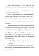 Cabe resaltar que del número de socios de la empresa que sólo cuentan con una concesión, hasta 2009, 23 trabajan con vehículos modelo y marca distinta a lo denominado “Administración SUBA”, es decir, distintos a los que reúnen los estándares que requiere el sistema de transporte local. Asimismo, como tal, la empresa SICTUHSA cuenta con cuatro concesiones, número mayor dentro del listado. En el caso de los vehículos registrados a nombre de la empresa integradora, se deja de lado cualquier dato que muestre el año del vehículo, el número de pasajeros y el tipo de la unidad; camión o autobús. En el listado resalta la concesión P020224HLLO, específicamente de la Ruta denominada 12 de octubre-Estación, que aparece como revocada sin dar mayor información en torno a los motivos por los cuales las autoridades dejaron sin efecto legal esta unidad de dicha ruta. Como nota metodológica de esta parte del capítulo, se encuentran las dificultades para la obtención del listado de concesionarios de transporte público urbano, en específico los que prestan el servicio dentro de la zona urbana de Hermosillo. Mediante el Oficio DGT.- 33 008732/2013 fechado el 28 de agosto de 2013 , la Secretaría de Infraestructura y Desarrollo Urbano (SIDUR) a través de la Dirección General del Transporte, emitió respuesta a una solicitud de información en la que se pide la lista de concesionarios actualizada hasta 2012. Tal solicitud fue aceptada, no obstante, considera la información como reservada por lo que es imposible darla a conocer. Sin embargo, en la página de Transparencia del Gobierno del Estado se encontró tal listado cuya última actualización data del año 2009 34 , fecha inicial del periodo de investigación (2009-2012). Tales contradicciones muestran la inexactitud con la que las autoridades manejan la información relacionada a las cuestiones administrativas de este servicio público, que si bien 33 Ver anexo 2 34 Ver anexo 3 93