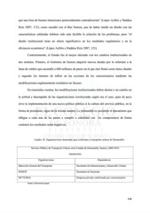 que una lista de buenas intenciones potencialmente contradictorias” (López Ayllón y Haddou Ruíz 2007, 115), como sucedió con el Bus Sonora, que de haber tenido un diseño con las características señaladas hubiera sido más factible la solución de los problemas, pues “el diseño institucional tiene un efecto significativo en los resultados regulatorios y en la eficiencia económica” (López Ayllón y Haddou Ruíz 2007, 123). Contrariamente, el Estado fue el mayor afectado con los cambios institucionales en dos sentidos. Primero, el Gobierno de Sonora adquirió nuevas deudas por lo referente a la línea de crédito que ascendió a 600 millones de pesos en el que éste firmó como único deudor y segundo los intentos de influir en las acciones de los concesionarios mediante las modificaciones reglamentarias resultaron un fracaso. En resumidas cuentas, las modificaciones institucionales deben alentar a un cambio en la actitud y desempeño de las organizaciones involucradas según sea el caso, pues de poco sirve la implementación de una nueva política pública si la cultura del servicio público, en la forma de prestación, sigue de la misma manera. Lo primordial es encontrar el mecanismo que obligue a cada una de las partes a cumplir a cabalidad con los compromisos de forma contraria los resultados serán negativos. Cuadro 18. Organizaciones detectadas que conforman al transporte urbano de Hermosillo. Servicio Público de Transporte Urbano en la Ciudad de Hermosillo, Sonora, 2009-2012 (institución) Organizaciones Dependencia Dirección General del Transporte Secretaría de Infraestructura y Desarrollo Urbano FEMOT Secretaría de Hacienda SICTUHSA Empresa privada conformada por concesionarios Fuente: Elaboración propia 144