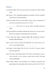 Bibliografía Acosta Romero, Miguel. 1988. Teoría general del derecho administrativo. México: Editorial Porrua. Brett, Eduard A.. 2001. Understanding organisations an institutions. The logic of pluralistic systems. México: El Colegio Mexiquense. Calafell, José Enrique. 1988. Los servicios públicos. Jurídica, anuario de departamento de derecho de la universidad iberoamericana (19): 191-208. ___________________ 1996. Teoría de la concesión. México. Universidad Autónoma de México. Centro de Investigaciones en Estadística Aplicada. 2004. Estudio sobre el transporte urbano. Buenos Aires, Argentina: Universidad Nacional de Tres de Febrero. De Rus, Ginés, Javier Campos y Gustavo Nombela. 2003. Economía del Transporte. Barcelona: Antoni Bosch Editor. Elster, Jon, 2003. Tuercas y tornillos. Una introducción a los conceptos básicos de las ciencias sociales. Barcelon: Gedisa. Erossa Martin, Victoria Eugenia. 2004. Proyectos de inversión en ingeniería. México: Limusa Noriega Editores. Flores Velez, Sofía y Efrén Sánchez Morales. 1998. Fuentes de financiamiento internas y externas enfocadas a la micro, pequeña y mediana empresa. México: Universidad Autónoma Metropolitana. Ganga Contreras, Francisco y Juan Félix Burotto. 2012. Asimetrías de información entre agente principal de las universidades chilenas. Estudios gerenciales (28) 122: 83-104. 151