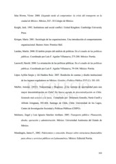 Islas Rivera, Víctor. 2000. Llegando tarde al compromiso: la crisis del transporte en la ciudad de México. México, D.F.: El Colegio de México. Knight, Jack. 1992. Institutions and social conflict. United Kingdom: Cambridge University Press. Krieger, Mario. 2001. Sociología de las organizaciones. Una introducción al comportamiento organizacional. Buenos Aires: Prentice Hall. Landau, Martín. 2000. El ámbito propio del análisis de políticas. En el estudio de las políticas públicas. Coordinado por Luis F. Aguilar Villanueva, 275-280. México: Porrúa. Lasswell, Harold. 2000. La orientación de las políticas públicas. En el estudio de las políticas públicas. Coordinado por Luis F. Aguilar Villanueva, 79-104. México: Porrúa. López Ayllón Sergio y Ali Haddou Ruiz. 2007. Rendición de cuentas y diseño institucional de los órganos reguladores en México. Gestión y Política Pública XVI (1): 101-145. Maillet, Antoine. (2012). Transantiago y Regiones. ¿Una ventana de oportunidad para una mayor descentralización en Chile? En Nueva agenda de descentralización en Chile. Sentando más actores a la mesa. Compilado por Delamaza Gonzálo, Nuria Cunill y Alfredo Joingnant, 585-604. Santiago de Chile, Chile: Universidad de los Lagos, Centro de Investigación Sociedad y Políticas Públicas (CISPO). Molinero, Ángel y Luis Ignacio Sánchez Arellano. 2005. Transporte público: Planeación, diseño, operación y administración. México: Universidad Autónoma del Estado de México. Mondragón, Jaime F., 2002. Fideicomiso y concesión. Ensayo sobre estructuras financiables para obras y servicios públicos en Latinoamérica. México: Editorial Porrúa. 153